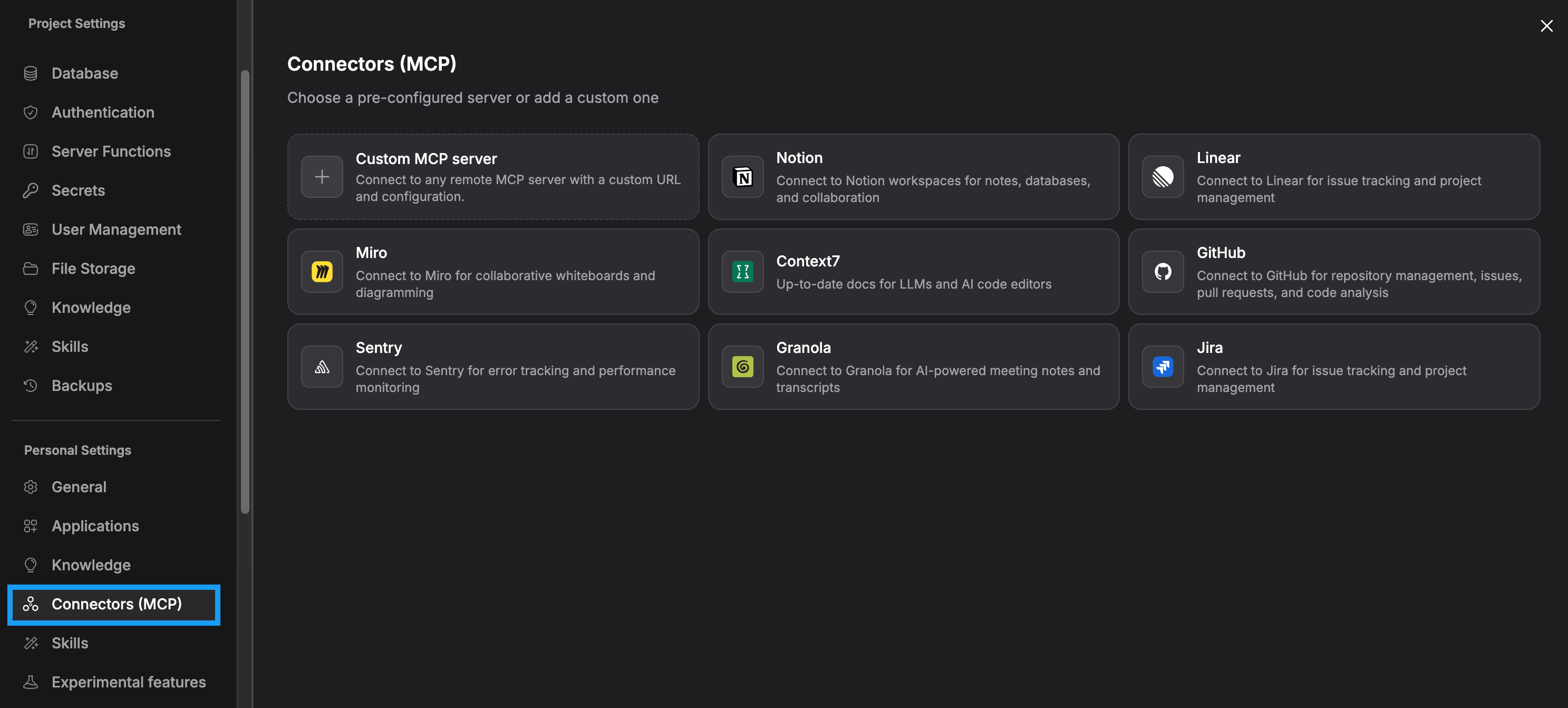 - From the Connectors (MCP) page, click a built-in connector (like Notion or GitHub).