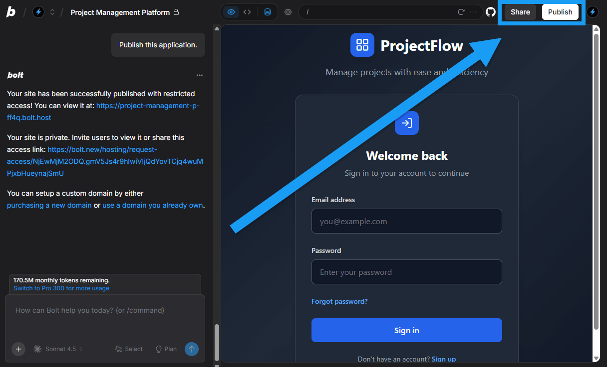 Every new Bolt project is automatically hosted on secure, high-performance servers. Your site loads quickly, stays online under heavy traffic, and is ready for search engines from the start. When you’re ready to share your project, you can either click Share (to publish your site with restricted access) or **Publish **(to publish your site fully publicly) in the top-right corner of your screen. There’s nothing else to configure.