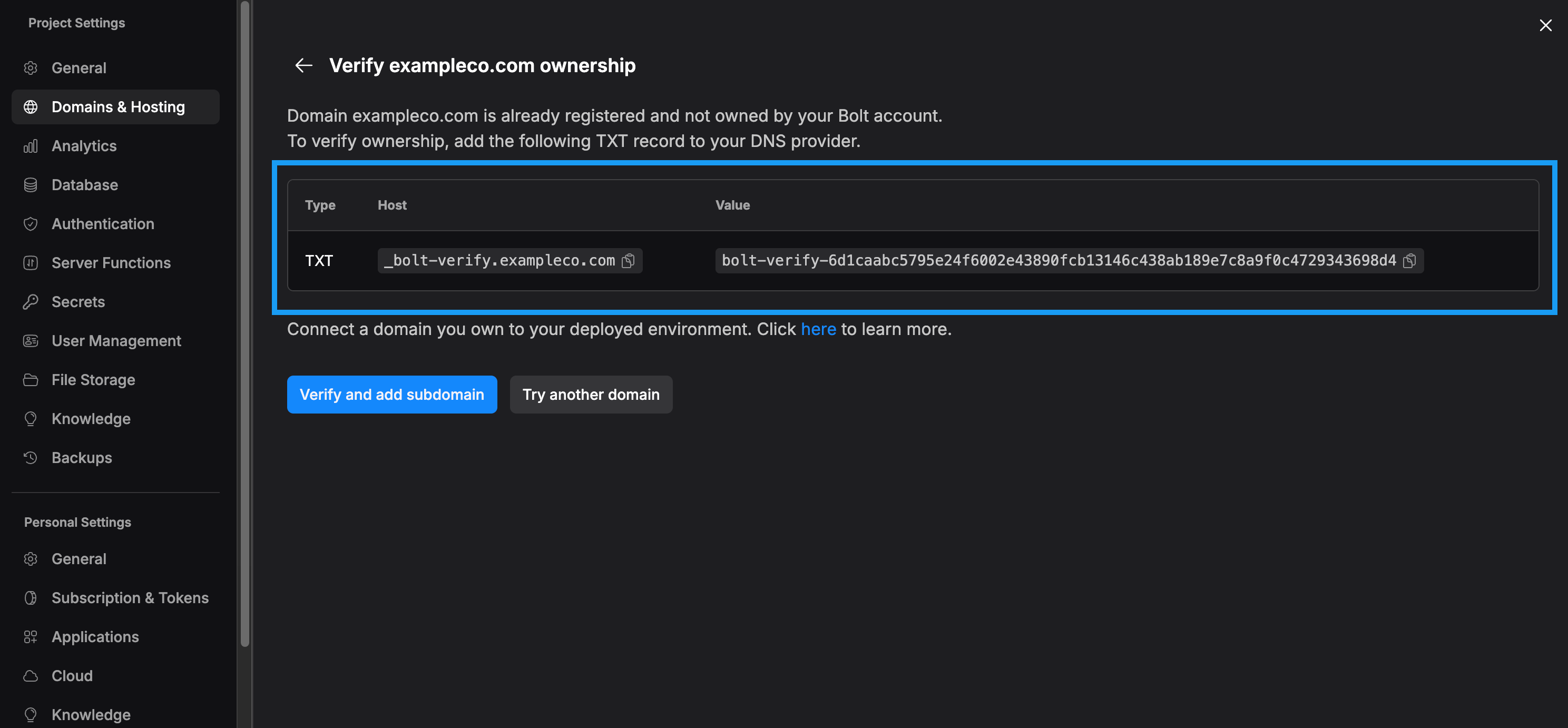 app.exampleco.com, not a root domain, like exampleco.com. You need to verify domain ownership before Bolt can attach a subdomain to your project.You only have to complete domain verification the first time you connect a subdomain. Unless you delete the DNS record, you won’t see this step again when connecting additional subdomains.